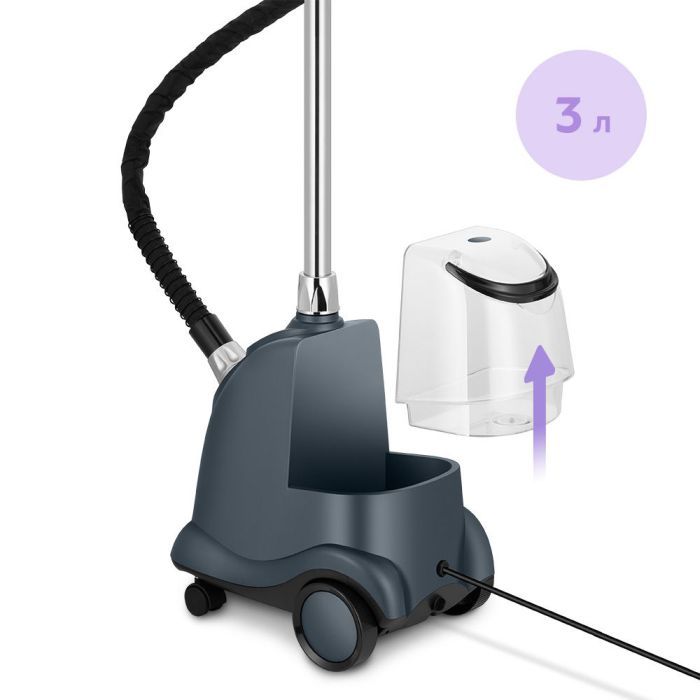 Съёмный резервуар для воды позволяет легко залить воду. Под резервуаром располагается ванночка, из которой вода перетекает в бойлер. Общая ёмкость резервуара составляет 3 литра, что позволит отпарить большое количество вещей за раз.