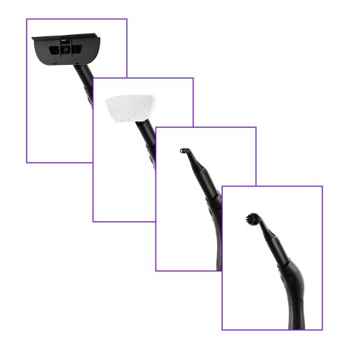 - Скребок для стекла используется для чистки окон, зеркал, кафеля. Струйная насадка подходит для чистки плинтусов, щелей и других углов. Щётки - для удаления стойких загрязнений. С тряпкой можно отпаривать одежду, шторы, мягкую мебель. И это далеко не всё!