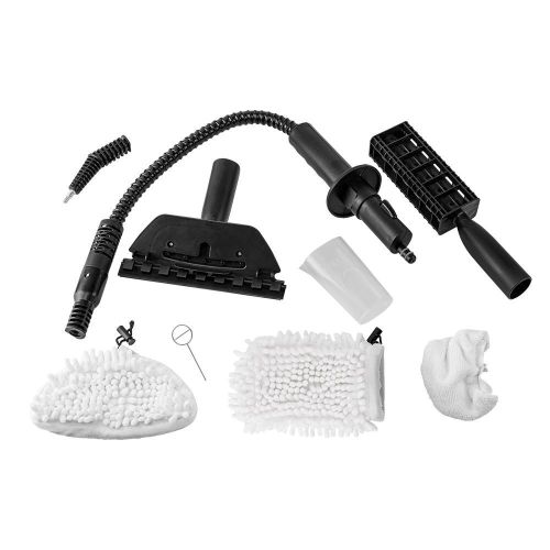 - В комплекте с ручным пароочистителем идут различные насадки: струйная насадка, съёмный паровой шланг, насадка с резиновым скребком, тряпка для отпаривания и стекла, прямоугольная насадка, тряпка для удаления пыли, круглая нейлоновая и латунная щетка.