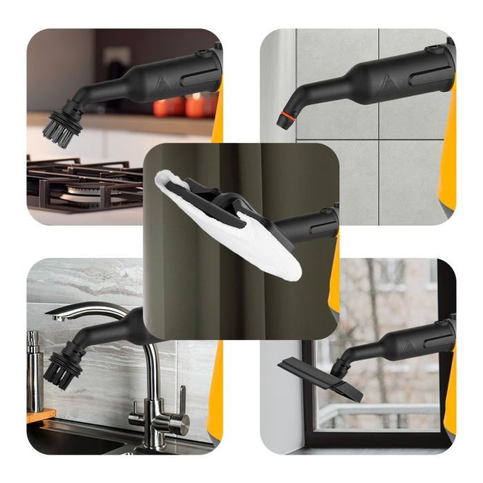 - Скребок для стекла используется для чистки окон, зеркал, кафеля. Струйная насадка подходит для чистки плинтусов, щелей и других углов. Щётки - для удаления стойких загрязнений. С тряпкой можно отпаривать одежду, шторы, мягкую мебель.