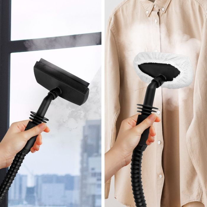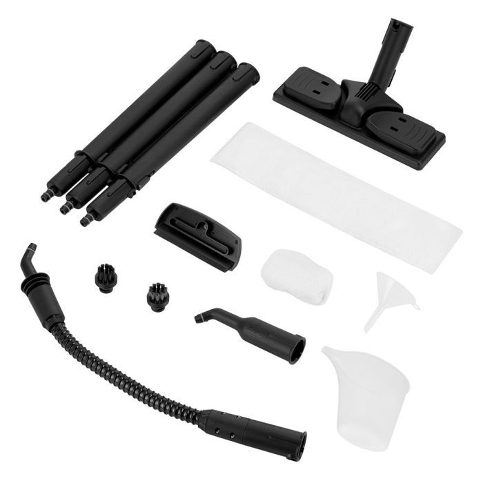- Удлинительная трубка надевается на паровое сопло, а к ней вы можете присоединить струйную насадку или щётку для пола. Паровой шланг облегчает чистку за счёт своей гибкости и помогает добраться до труднодоступных мест.