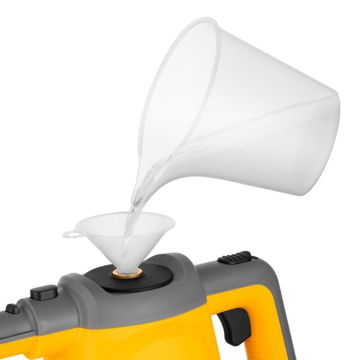- В комплекте с пароочистителем идёт воронка и мерный стакан для удобного добавления воды в бойлер. Ёмкость бойлера составляет 0,45 л.