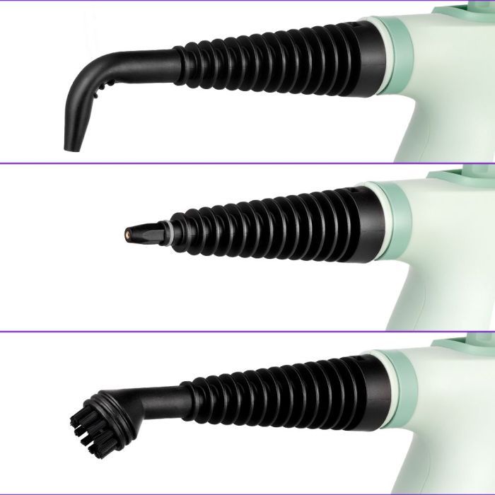 - Сопло струйной насадки создаёт мощную струю пара, способную напором выбить грязь из щелей и углублений. С угловой насадкой удобнее очищать углы и радиаторы отопления. Круглая нейлоновая щётка используется для удаления более стойких загрязнений.