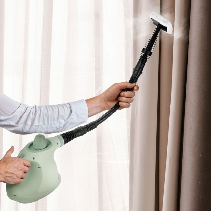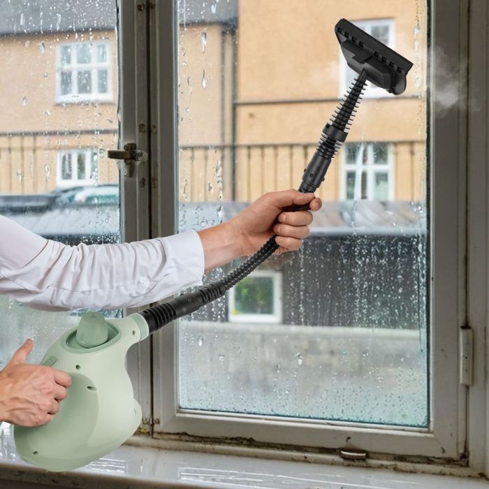 - Если на насадку для отпаривания установить насадку с резиновым скребком, то можно очистить окна, зеркала, душевые кабинки, кафель и другие гладкие поверхности. Паровой шланг облегчает чистку в труднодоступных местах благодаря своей гибкости.
