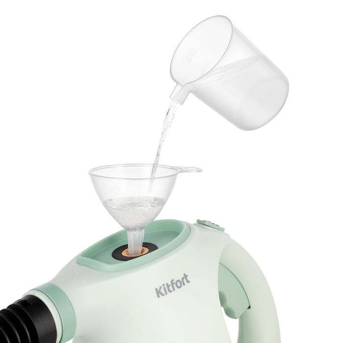 - В комплекте с пароочистителем идёт воронка и мерный стакан для удобного добавления воды в бойлер ёмкостью 350 мл. На разогрев воды уходит всего 3 мин. Время непрерывной подачи пара составляет 8-10 мин.