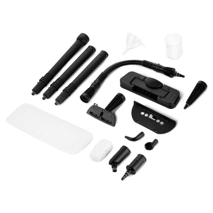 - С пароочистителем идёт богатый набор насадок, тряпок, удлинительных трубок, а также гибкий шланг, напольная щётка, мерный стакан и воронка.