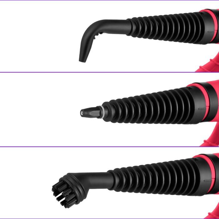 - Гибкий шланг поможет добраться до труднодоступных мест. Если установить насадку с резиновым скребком, то можно очистить любые гладкие поверхности вроде окон или зеркал. Надетая на насадку тряпка подойдёт для отпаривания ткани и обивки мягкой мебели.