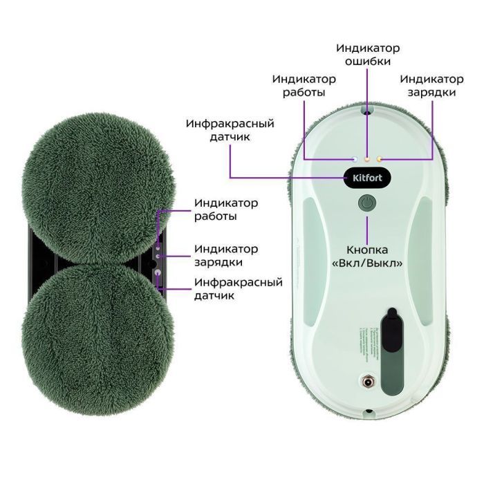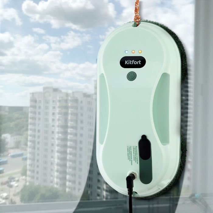 Робот Kitfort КТ-5189 предназначен для мытья стёкол изнутри и снаружи, кафельных и зеркальных покрытий в жилых домах и офисах. Робот оснащён вентилятором, благодаря которому создаётся разрежение, и он надёжно удерживается на вертикальной поверхности. Мощность 80 Вт. Длина страховочного троса 4 м.