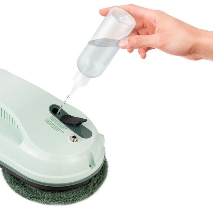 - Перед уборкой вы можете распылить на стекло обычную чистящую жидкость для стёкол или воду, используя бутылочку с распылителем. В комплекте идут 2 держателя тряпки, 10 тряпок, 2 батарейки ААА, страховочный трос, пульт ДС и блок со шнуром питания.