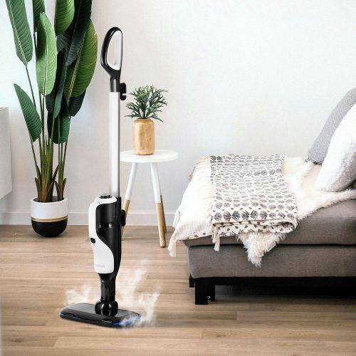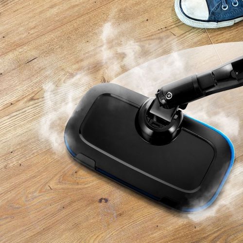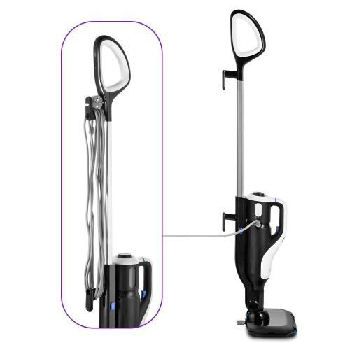 - На удлинительной ручке предусмотрены держатели для шнура. Принцип работы паровой швабры прост. Вода из резервуара подается помпой (водяной насос) в заранее прогретый до высокой t бойлер. В бойлере вода моментально преобразуется в пар и выходит из сопла.