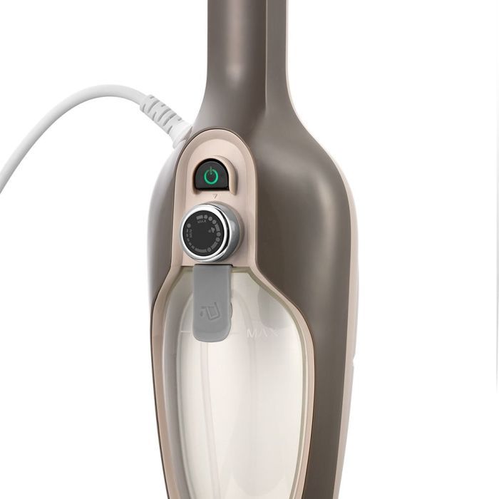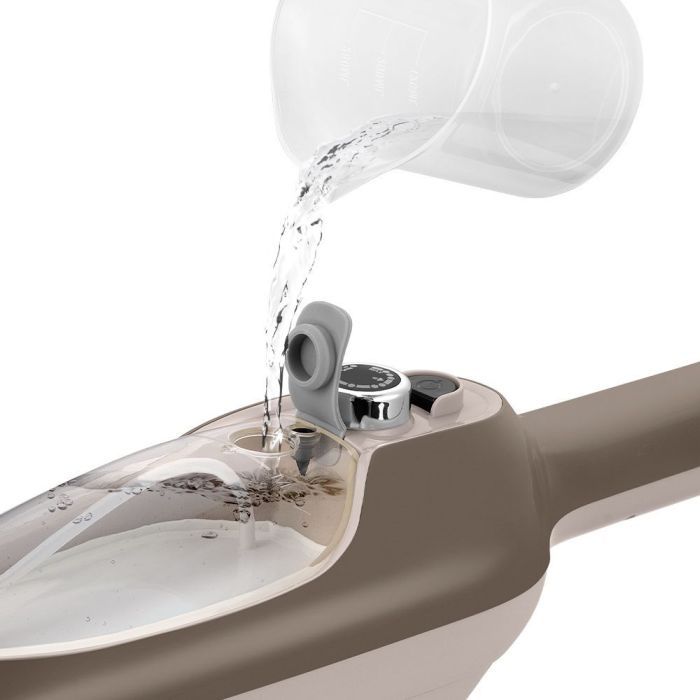 - Устройство оснащено съёмным резервуаром для воды ёмкостью 280 мл, что позволяет производить непрерывную уборку до 14 минут в зависимости от интенсивности выходящего пара. Для удобного наливания воды в комплекте предусмотрен мерный стакан.