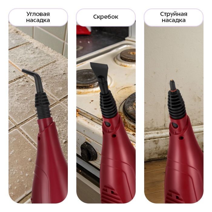 - Конструкция «2 в 1» предусматривает использование ручного модуля паровой швабры с насадками без присоединения к нему удлинительной ручки. Струйная и угловая насадки, и скребок, используются для очистки щелей и углов.