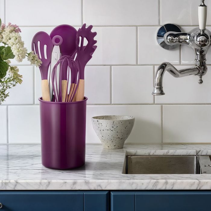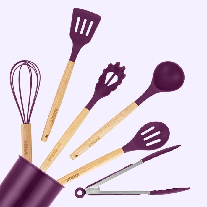 Набор кухонных принадлежностей КТ-1263 состоит из стакана для хранения и 6 кухонных аксессуаров: половника, лопатки с прорезями, ложки для спагетти, ложки с прорезями, венчика и щипцов. Изделия выполнены из безопасного силикона. Размер 31,5 х 7 см.