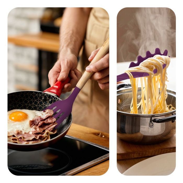 Термостойкий силикон аксессуаров выдерживает температуру +220°С. Все аксессуары, кроме щипцов, имеют деревянную рукоятку. Деревянная рукоятка не нагревается в процессе готовки, поэтому вы не обожжётесь об неё.