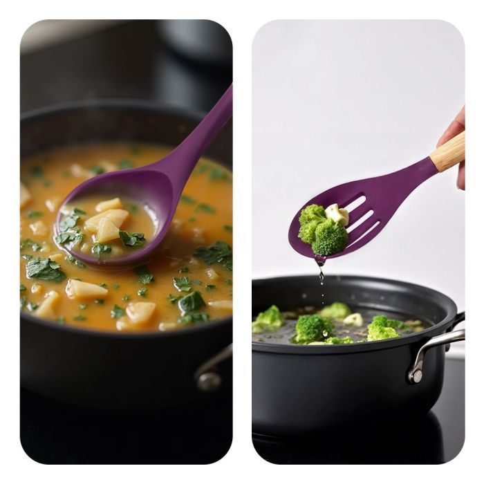 Половник предназначен для разлива жидких блюд в порционную посуду. А ложкой с прорезями можно легко извлечь продукты из жидкости.
