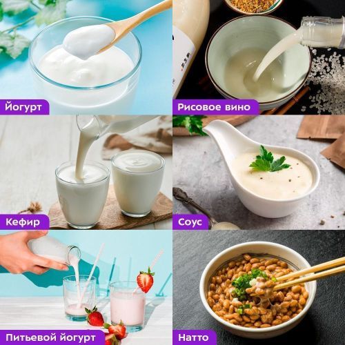 - Кнопкой «Режим» можно выбрать 1 из 6 предустановленных программ. Вы можете приготовить йогурт, питьевой йогурт, кефир, соусы, рисовое вино и даже натто. Натто – это традиционное японское блюдо, приготовленное из сброженных соевых бобов.