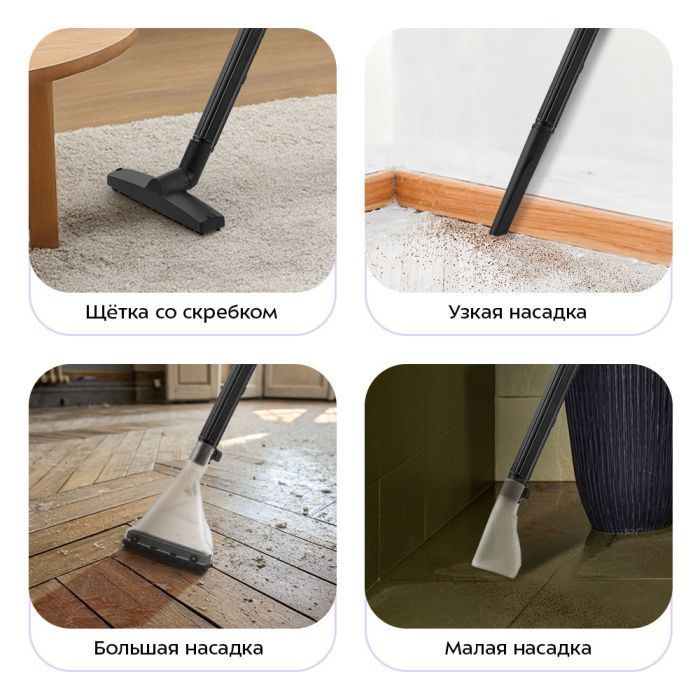 - Щётка со скребком подходит для мытья полов и удаления воды. Узкая насадка позволяет очищать труднодоступные места. Большая насадка со скребком и ворсом предназначена для влажной уборки больших поверхностей, а малая — для небольших участков.