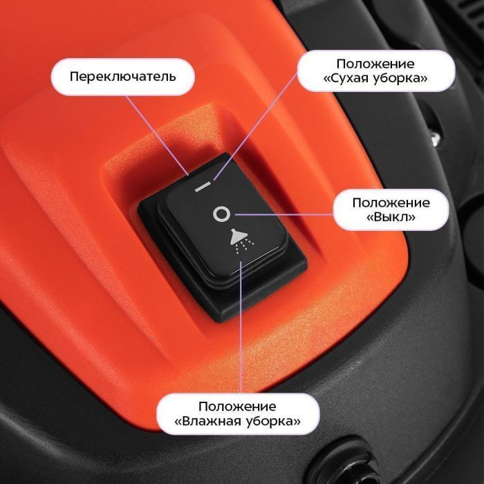- Переключатель включает пылесос в режиме сухой или влажной уборки, а также выключает прибор. У переключателя есть три положения: «Сухая уборка», положение «Выкл» и положение «Влажная уборка».