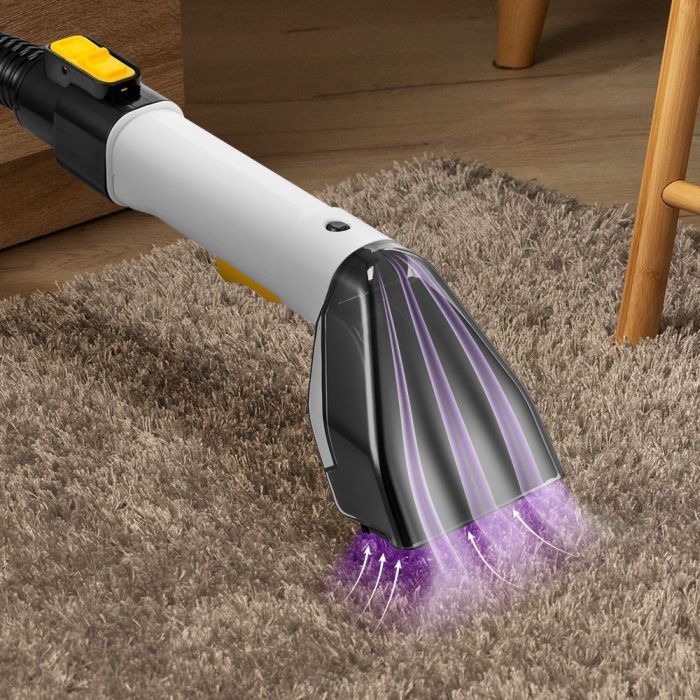 - Пылесос автоматически подаёт чистую воду на поверхность, а затем всасывает её с загрязнениями. Распылите небольшое количество воды, а затем прижмите всасывающее отверстие к мокрой поверхности и плавно перемещайте насадку.