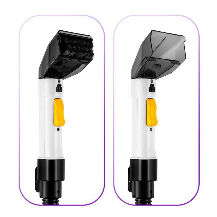 - Насадка с ворсовой щёткой хорошо подходит для чистки ковров или въевшихся загрязнений. Она выполнена из прозрачного пластика, чтобы было видно, как много грязи собирает моющий пылесос.