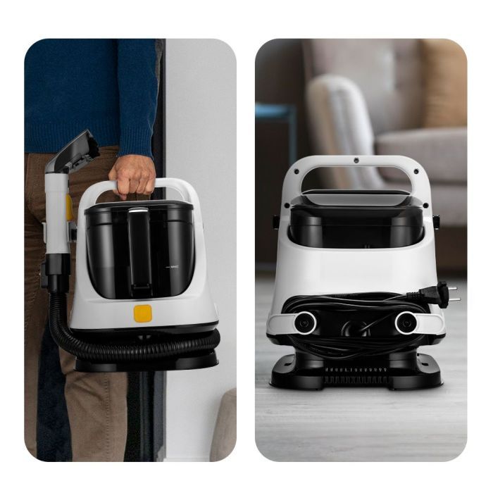 - У пылесоса небольшой размер и вес, а также есть ручка, держась за которую можно с лёгкостью перемещать прибор. У моющего пылесоса предусмотрены держатель шнура и держатель шланга, поэтому его можно компактно сложить и удобно хранить.
