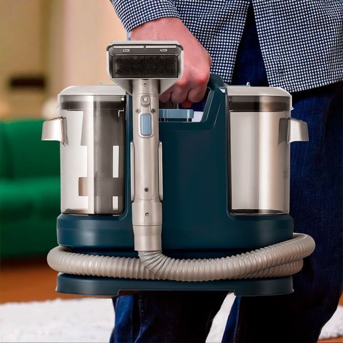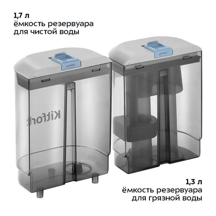 - В резервуар для чистой воды ёмкостью 1,7 л можно добавлять воду или воду со специальным чистящим средством. В резервуаре для грязной воды ёмкостью 1,3 л предусмотрена защитная вставка с поплавком, который защищает двигатель от попадания влаги.