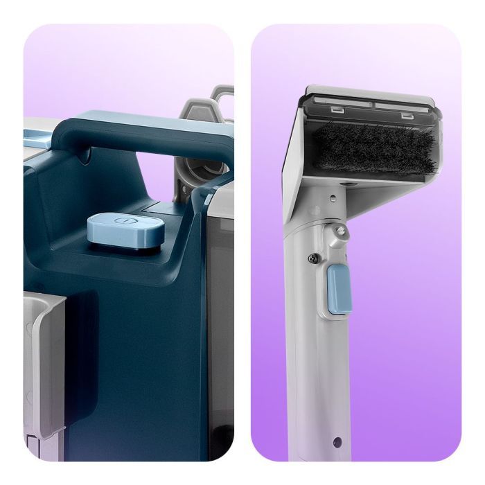 - Управление моющим пылесосом интуитивно понятно: кнопка «Вкл/Выкл» запускает и останавливает работу, а кнопка подачи воды на насадке помогает в более удобном контроле за количеством воды.
