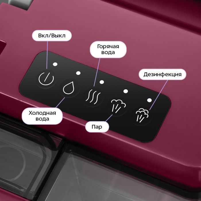 - Кнопка «Вкл/Выкл» включает и выключает устройство. Прибор оснащён несколькими режимами работы: «Холодная вода», «Горячая вода», «Пар» и «Дезинфекция».
