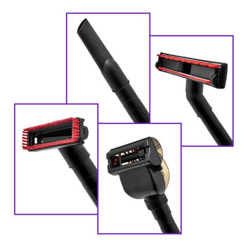 - Чтобы насадки хранились в одном месте и не терялись, на удлинительной трубке пылесоса имеется держатель для насадок. Меняйте их прямо во время уборки!