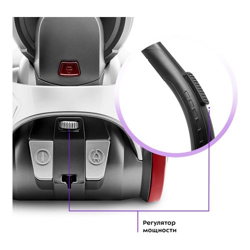 - Кнопки Вкл/Выкл и автоматической смотки шнура можно нажать ногой. Выбор мощности осуществляется регулятором. Max мощность подойдёт для очистки ковров и сильных загрязнений, min - для уборки гладких поверхностей с лёгкой степенью загрязнения.