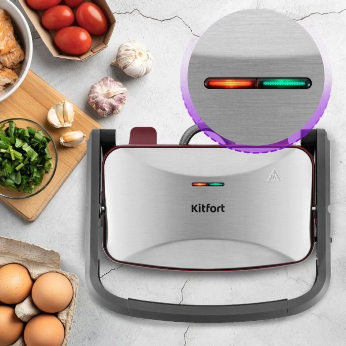 - Бутербродница оснащена термостатом для поддержания температуры панелей, а также индикаторами питания и нагрева. Индикатор питания горит, когда прибор включен в сеть, а индикатор нагрева горит, пока панели разогреваются.
