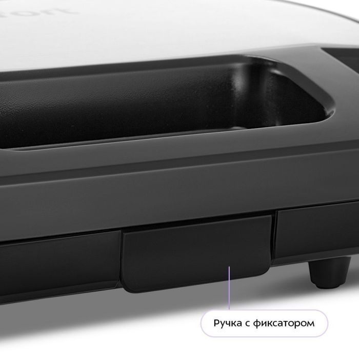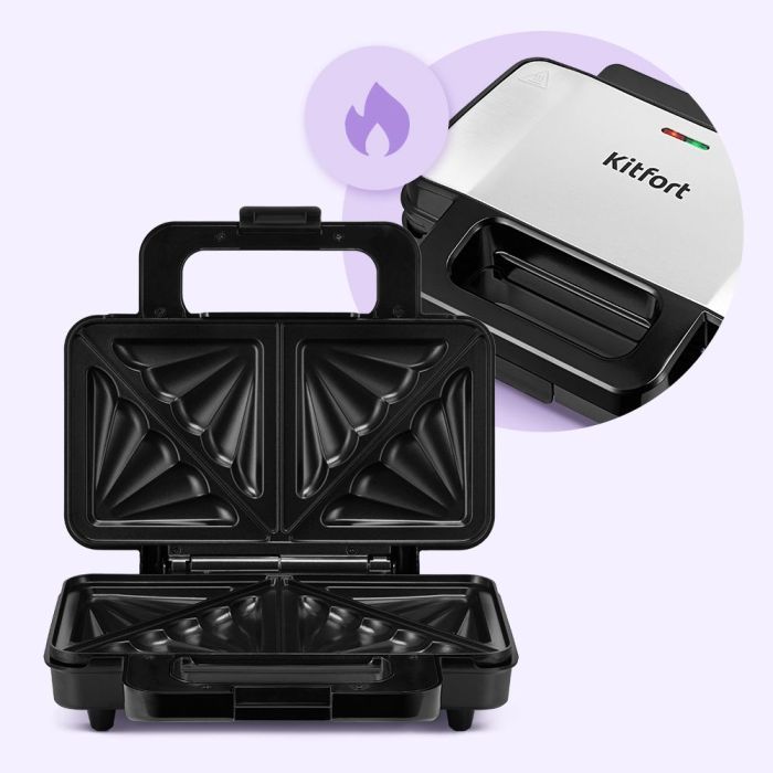 - Бутербродница KT-4623 оснащена ручкой с фиксатором, что обеспечивает безопасность во время готовки и хранения. Чтобы избежать травм и ожогов, используйте кухонные рукавицы или прихватки при открывании и закрывании крышки.
