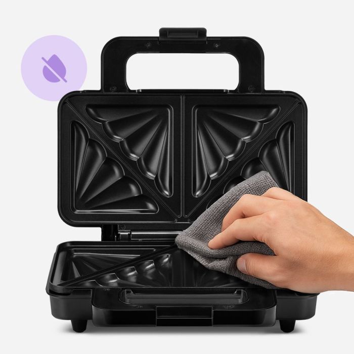 - Бутербродница оснащена двумя нагревающимися панелями и позволяет готовить с закрытой крышкой, обеспечивая равномерное обжаривание бутербродов с обеих сторон. Это ускоряет процесс приготовления, исключая переворачивание блюд в процессе готовки.