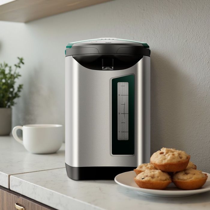 - Благодаря двойным стенкам резервуара вода в термопоте будет остывать достаточно медленно. Корпус термопота состоит из нержавеющей стали и пластика, а резервуар и внутренняя часть крышки — из нержавеющей стали.