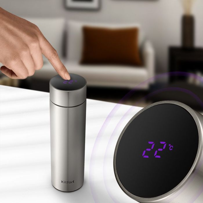 - Стильный дизайн, лаконичность формы и цвет термоса КТ-1221 обеспечат вам дополнительное удовольствие в использовании. Для того чтобы посмотреть температуру напитка внутри термоса, просто слегка прикоснитесь к дисплею на крышке.