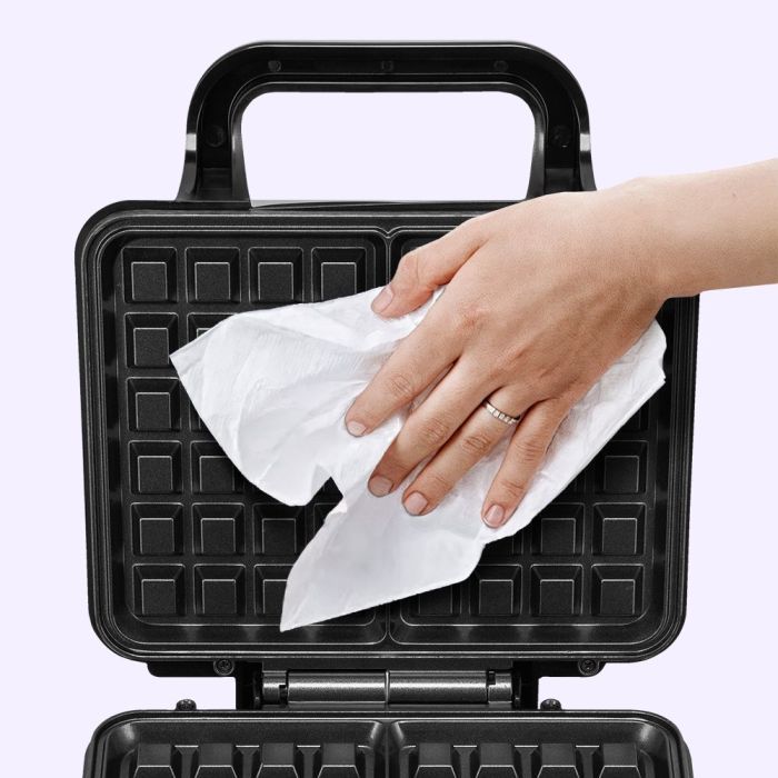- Очищайте панели бумажными полотенцами, удаляя остатки теста. Затем протрите мягкой влажной тканью. При сильных загрязнениях используйте немного мягкого моющего средства. Избегайте абразивных средств, чтобы не повредить антипригарное покрытие.