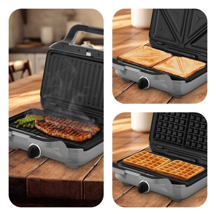 Вафельница «3 в 1» КТ-5605 предназначена для приготовления бельгийских вафель, бутербродов, панини, сэндвичей, гренок, тостов, овощей, сосисок и многих других блюд. Компактные размеры вафельницы дают возможность взять её с собой на дачу или в поездку. Мощность 900 Вт. Размер панели 268 х 151 мм.