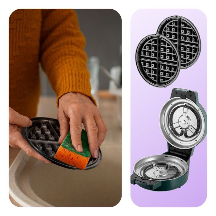 - Антипригарное покрытие панелей вафельницы не даёт прилипнуть тесту в процессе приготовления и позволяет готовить с минимальным количеством масла. Для удобства ухода панели сделаны съёмными — их можно мыть под проточной водой.