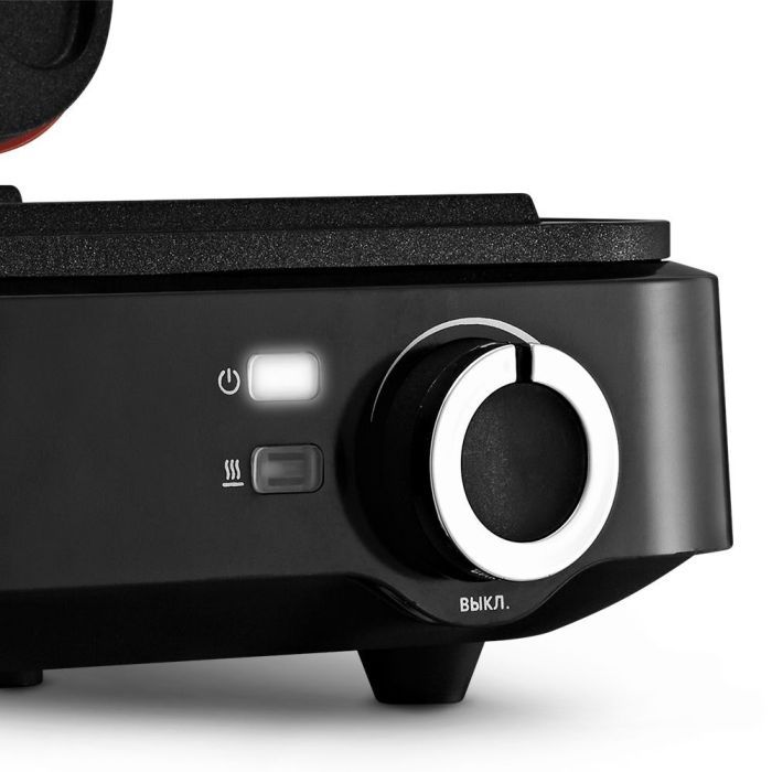 Электрическая вафельница имеет корпус, выполненный из прочного термоустойчивого пластика. В вафельнице установлены нагреватели в каждой половине. Прорезиненные ножки не дают прибору скользить по столу во время готовки.