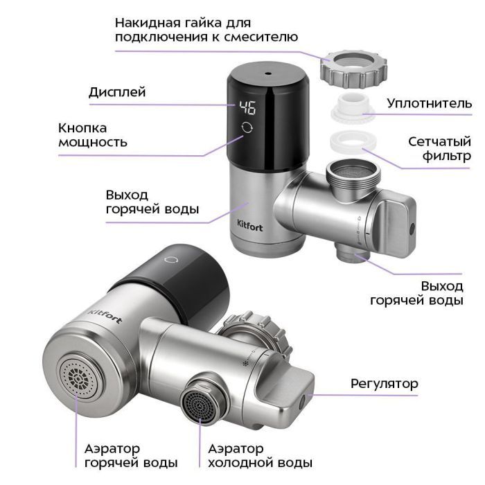 Водонагреватель КТ-6526 имеет 2 выхода для воды: горячей и холодной, с отдельными аэраторами, отверстие для слива воды, место подсоединения к смесителю, сетчатый фильтр и накидную гайку для подсоединения.
